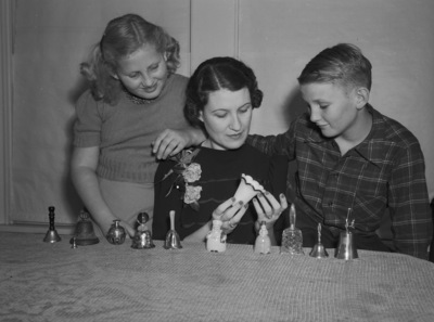 Mrs. Randolph F. Duggan Junior and her children, Marilyn and Randolph F. Duggan III, examine a new addition to Mrs. Duggan's collection of tea bells which range in size from one inch to several inches, and from china to copper and brass. A friend started her on the hobby.