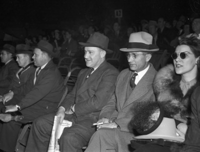 Among the spectators at the opening night of the Golden Gloves District Tournament were Doctor Abe Greines (third from right) and Doctor H. V. Helbing (second from right). At the far left are three unidentified men. At the far right, sitting beside Doctor Helbing, is an unidentified woman. Both doctors are wearing suits and fedoras. Doctor Greines is holding a newspaper. Doctor Helbing is holding a cigarette. The woman at the right is wearing a blouse, skirt and a fur scarf.