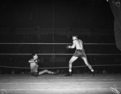George Kramig, North Texas Agricultural College (N. T. A. C.) lightweight, right, standing, and Sammy Bates, on the floor, during a bout at the Golden Gloves District Tournament at Will Rogers Memorial Coliseum. Both boxers are wearing athletic shorts and boxing gloves.
