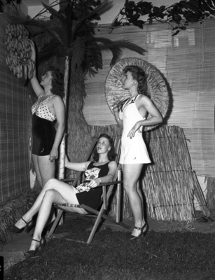 The National Fashion Exhibitors of America are holding a ten-day show at the Hotel Texas. Modeling some of the new Summer styles left to right are Frances Bales, Evelyn Woodard, seated, and Helen Smith. Miss Bales is wearing a green water velva suit with contrasting polka dot top. She is reaching for a banana in a tree. Miss Woodard is relaxing in a lounge chair. She is dressed in a swimsuit with a printed flare skirt in green with a printed front panel. Miss Smith is wearing a nautical white and navy swimsuit. She is shown twirling an umbrella on their artificial beach.