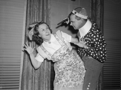 The Medical Auxiliary is putting on a variety of skits for a benefit at the Women's Club. The actors are shown gathering after their performance. They are Dr. W. F. Parsons and Mrs. I. B. Baker. The "mean old boy", Dr. Parsons, is squirting a water pistol at Mrs. Baker. He is dressed in a cap, a polka-dot shirt and trousers. Mrs. Baker, president of the dental auxiliary, is striking a frightened pose for the camera. She is wearing a checkered ribbon in her hair and a floral pinafore dress.