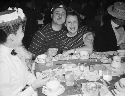 The Medical Auxiliary is putting on a variety of skits for a benefit at the Women's Club. The actors are shown gathering for dinner after their performance. They are left to right Dr. H. A. Zappe and Mrs. W. F. Slaughter. They found themselves table partners with a kindred birthday month. Dr. Zappe, of Mineral Wells, Texas, is wearing a hat with knick-knacks hanging from the sides and a striped shirt. Mrs. W. F. Slaughter, of Fort Worth, Texas, is wearing a short-sleeve striped shirt. Other actors are sitting at the table, dressed in their costumes. Mrs. Joe R. Wise is sitting on the left, in the foreground.