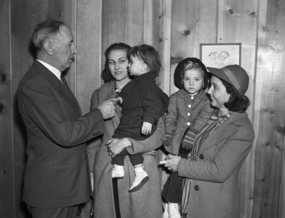 The Fort Worth Lions Club is hosting a Baby Contest. Participating in the contest left to right are J. J. Russell, Mrs. J. C. Davis and daughter Julia Marie, Mrs. B. J. Robinson, and daughter Velma Jo. Mr. Russell is the baby clinic director. He is dressed in a suit and shaking hands with Julia Marie. Mrs. Davis is dressed in a winter coat. Julia Marie is wearing a baby's snowsuit. Mrs. Robinson is dressed in a hat, striped blouse, and a coat. Velma Jo is wearing a hat, plaid coat, striped gloves, and trousers. The back wall features wood paneling and a framed drawing of an infant.