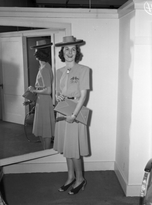 Americana is the theme of present fashions, with all kinds of influences noted in the costumes. New styles feature a predominance of red, white, and blue. Miss Etta Cohen is posing in front of a mirror as she models one of the new outfits. She is wearing a novelty weave beige frock with the Southwest influence apparent in the embroidery detail on the pocket and in the pin at the neck. The ensemble is accompanied with a cowboy effect hat, a tan saddle bag, and gloves.