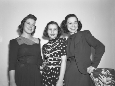 Miss Lyle Rose Hankerson, center, is house guest of two of her former Tyler High School classmates, Miss Martha Kelley (left) and Miss Margaret Kelly (right), daughters of Mr. and Mrs. E. D. Kelley. Ms. Hankerson is in a polka dot dress; Martha wears a dress with sheered neckline and a brooch; Margaret wears a matching dress and coat. Published in the Fort Worth Star-Telegram evening edition, January 31, 1941.