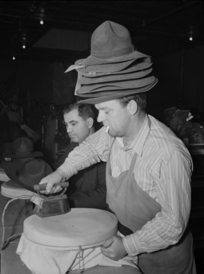 Campaign hats from Fort Sam Houston are being cleaned and blocked at the Peter Brothers Incorporated. Cecil Haynes, right, ironing out the wrinkles in an old hat. He is wearing a stack of hats on his head, a shirt and apron. Tom Peters, left, operator of Peter Brothers Incorporated repair shop, is examining a hat. Hats are processed at a rate of 140 a day. Published in the Fort Worth Star-Telegram evening edition, January 31, 1941.