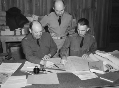 Personnel at Camp Wolters are busy building and preparing for its opening as a replacement center for selective service trainees. Discussing a camp site left to right are Major Irving Compton, Captain Philip W. Mallory, and Major W. H. McKee. Major Compton is the executive officer of the 8th Training Battalion. He is sitting at the table dressed in his military uniform. Captain Mallory is with the Medical Corporation. He is standing behind the men, dressed in his military uniform. Major McKee is the post adjutant. He is pointing at the map, wearing his military uniform. Published in Fort Worth Star-Telegram, morning edition, February 7, 1941.