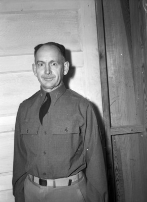 Personnel at Camp Wolters are busy building and preparing for its opening as a replacement center for selective service trainees. Captain Walter R. Linn is a camp mess officer. He is back on army duty after seventeen years of managing the dining room at Fort Worth's Masonic Home and School. He is standing against a wall, dressed in his military uniform. Published in Fort Worth Star-Telegram, morning edition, February 7, 1941.
