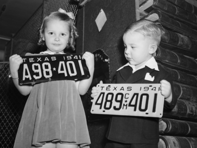 Diane Bourland, four, and Jackie Bourland, three, holding the nineteen-fortyone auto license plates.