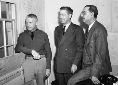 Camp Barkeley is being constructed in Abilene, Texas to train the 45th Infantry Division of the United States Army. Building crews are working quickly to make the camp ready for the March opening. Active leaders of the construction race are left to right, Major Richard E. Froiseth, Marvin C. Nichols, and Thomas S. Byrne. Major Froiseth is the construction quartermaster, he is wearing his military uniform. Mr. Nichols, of Fort Worth, Texas, is the architectural engineer in charge of the project. He is dressed in a double breasted pinstripe suit. Mr. Byrne is the general manager and a member of the contracting organization of Taylor, Byrne, and Briggs. Mr. Byrne is dressed in a three piece suit. The men are gazing out the window of one of the new buildings.