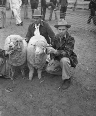 Fisher County Show. Clifford Jameson of Dowell with his grand champion fine wooled lambs F. W. Martin in background.