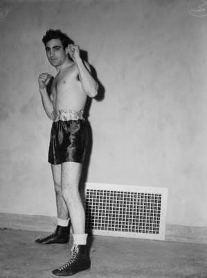 James V. Nasche, welterweight boxer, competed in the Golden Gloves District Tournament in Fort Worth, Texas. He is standing in front of a blank wall, posing in a fighting stance. He is wearing athletic shorts and is shirtless.