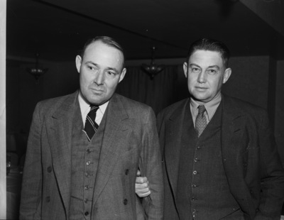 Left to right, Glenn Halsell, Fort Worth, Texas, and Jamie Brook, Brady, Texas, attendees at the Texas and Southwestern Cattle Raisers Association meeting at the Blackstone Hotel. They are standing next to each other and wearing suits. Published in Fort Worth Star-Telegram, morning edition, January 27, 1940.