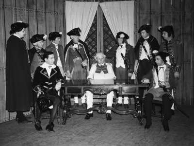 Masonic Temple, play cast. Left to right, Sam Cantey the third, J. E. Madden, Charles Tate, H. L. Davenport, George S. Garnett,, J. R. Weir, W. K. Brown, Ardell Young, and E. F. Hotopp