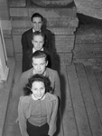These newly elected freshmen class officers at Texas Christian University (T. C. U.) will direct freshmen activities during the spring semester. The officers are, top to bottom, George Towles, of Dallas, Texas, student council representative, Joe Ed Hill, of Eldorado, Texas, vice president, Dan Wray, of Washington, D. C., president, and Shirley Glasscock, of Pecos, Texas, secretary-treasurer. The students are standing at the top of a stairway. The men are wearing suits and Miss Glasscock is wearing a blouse, coat and a skirt.
