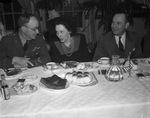 Brownwood Chamber of Commerce banquet at Hotel Brownwood; from left, Maj. Gen. Claude V. Birkhead, commander of Camp Bowie 38th Division; Mrs. B.P. Bludworth, wife of Brownwood Chamber president; and Mayor Wendell Mayes of Brownwood, 02/13/1941. They three are seating at a table with food on top.