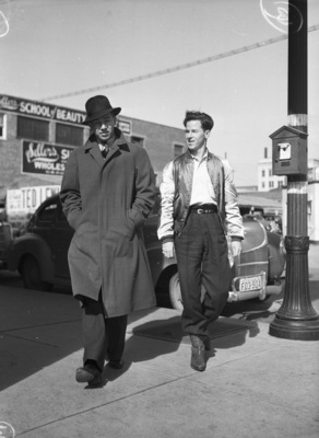 Defending heavyweight champion Aubrey Poole, of Houston, Texas, shown walking on a sidewalk with Jimmy Hensley, Houston, Texas, welterweight champion, as the boys headed for the Fort Worth Club to weigh-in for the state Golden Gloves tournament to be held at Will Rogers Memorial Coliseum. Poole is wearing an overcoat and a hat. Hensley is wearing a collared shirt, trousers and a letterman jacket. Behind them is an automobile parked on the side of the street.