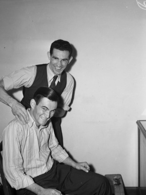 Joe Kopp, middleweight boxing champion, rubs a kink out of the neck of Frank Barranco, light-heavyweight, before they compete in the Golden Gloves State Tournament at Fort Worth, Texas. Both are from Beaumont, Texas. Barranco is sitting in a chair and Kopp is standing behind him. Kopp is wearing a collared shirt, necktie, vest and trousers. Barranco is wearing a striped collared shirt and trousers. Both men are smiling.