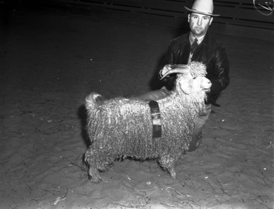 Prize winning Champion C. type angora buck, owned by Marvin Skaggs of Junction, Texas, at the Southwestern Exposition and Fat Stock Show. The goat show this year has the biggest list of entries in the history of the event at the Stock Show. Mr. Skaggs is posing with his prize winning goat.