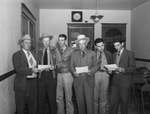 McCulloch County 4-H Club and FFA. Boys in Fort Worth. Left to right, O. C. Willimson, Rochelle rancher; R. F. McSwain, county agent, Talmadge Wood, vocational instructor, Doole; J. L. Watson, Salesman, Fort Worth and M. A. Westerman and T. O. Sturkey, Vocational instructors respectively of Melvin and Rochelle.