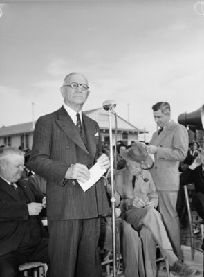 A ceremony is being held near Abilene, Texas to officially turn Camp Barkeley over to the military. The camp will serve as a training facility for the 45th Infantry Division, based out of Fort Sill, Oklahoma. James T. Taylor, of Fort Worth, Texas, is standing at the microphone. He is responding to the tributes paid to the builders by Abilene leaders. Mr. Taylor is dressed in double breasted, three-piece pinstripe suit. There is a crowd of people seated in the background.