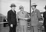 A ceremony is being held near Abilene, Texas to officially turn Camp Barkeley over to the military. The camp will serve as a training facility for the 45th Infantry Division, based out of Fort Sill, Oklahoma. Attending the ceremony left to right are Marvin C. Nichols, W. P. Wright, and Thomas S. Byrne. Mr. Nichols, is the architectural engineer. He is dressed in a hat and a double breasted pinstripe suit. Mr. Wright is the past president of the Abilene Chamber of Commerce. He is wearing a hat and a double breasted suit. He is congratulating both Mr. Byrne and Mr. Nichols. Mr. Byrne, is the general manager for camp contractors. He is dressed in a hat and a three-piece, double breasted suit. There is a crowd of people in the background standing between the tents and a building.