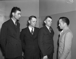 The Brewer Murder Trial is underway at the Tarrant County Courthouse. In attendance are the four brothers of the victim H. Glen Cox. They are left to right, John W. Bailey (half brother), Joe Leslie Cox, Tinsley Earl Cox, and Elmer Lewis Cox. Earl T. Brewer is on trial for murdering his son-in-law H. Glen at an east-side apartment on January 10, 1941. H. Glen's marriage to Virginia Brewer, fourteen, led to his death. The Brewers and the Cox Family live on neighboring farms in Fannin County, Texas. John is dressed in a double breasted pinstripe suit. Joe is wearing a three-piece suit. Tinsley is wearing a three piece suit and holding his hat. Elmer is dressed in a light, double breasted suit.