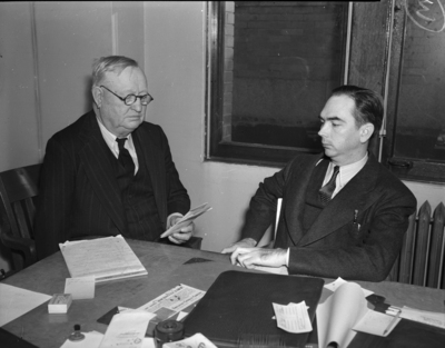 The Brewer Murder Trial is underway at the Tarrant County Courthouse. S. F. Leslie, left, is a veteran Bonham attorney who was employed as a special prosecutor on the case. Earl T. Brewer is on trial for murdering his son-in-law H. Glen Cox at an east-side apartment on January 10, 1941. H. Glen's marriage to Virginia Brewer, fourteen, led to his death. The Brewers and the Cox Family live on neighboring farms in Fannin County, Texas. Mr. Leslie is sitting at a table, dressed in a three-piece pinstripe suit. There is an unidentified man at the right. The desk is covered in papers, notes, and folders. There is a window on the back wall.