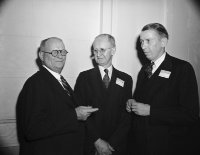 Left to right, A. I. Lundberg, mechanical superintendent of the Star-Telegram and chairman of arrangements for the conference; Walter C. Johnson of Chattanooga, Tennessee, secretary manager of the Southern Newspaper Publishers Association; and C. W. Tabb, manager of the Dallas office of Southern Newspaper Publishers Association Mechanical Conference. They are in Fort Worth to attend the meeting of the western division of the Southern Newspaper Mechanical Conference. Mr. Lundberg is shown explaining the Summer-in-February weather to Johnson. All of them are wearing suits and ties. Published in the Fort Worth Star-Telegram morning edition, February 17, 1941.