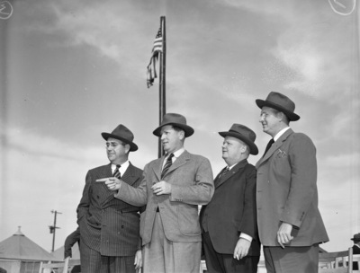 From left, Everett Speer, M.B. Killian, Ed S. Stewart, and James H. Bond inspect Camp Barkeley at Abilene; Stewart heads Chamber of Commerce, Killing is engineering construction chief, Bond is personnel director and Speer is assistant director, 02/17/1941. The image shows the four men standing and looking at something.
