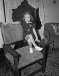 Five year old Sandra Ann Leach is sitting on the arm of a chair with a unique history. Harry Jackson, a snake man at Forest Park Zoo made the chair from the teak wood crate in which "Penny," the baby elephant was brought into the country from India. The upholstery was made from elephant "Sugar," who was killed in July after attacking Mr. Jackson. The chair is on display at Forest Park Zoo. Sandra Ann is wearing a sailor dress.