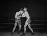 Bill Looker, of Grapeland, Texas, left, won the lightweight title at the Golden Gloves State Tournament by defeating Carney Boyd, right, of Olney, Texas. Both boxers are wearing athletic shorts and boxing gloves. Spectators sitting ringside can be seen in the background.