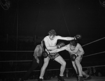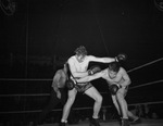 Shot of the third round of the heavyweight championship bout between Aubrey Martin, right, and Jay Turner at the state Golden Gloves tournament at Will Rogers Memorial Coliseum. Turner went on to win the decision.