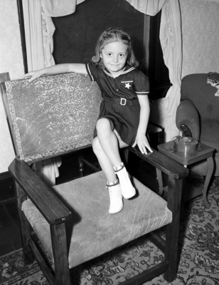 Image shows Five year old Sandra Ann Leach is sitting on the arm of a chair with a unique history. Harry Jackson, a snake man at Forest Park Zoo made the chair from the teak wood crate in which "Penny," the baby elephant was brought into the country from India. The upholstery was made from elephant "Sugar," who was killed in July after attacking Mr. Jackson. The chair is on display at Forest Park Zoo. Sandra Ann is wearing a sailor dress. Published in the Fort Worth Star-Telegram morning edition February 18, 1941.