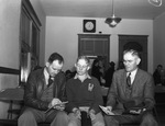 County Agent G. T. Hackney of Baylor County, who arranged the field day at the market with Curtis Lee Brock of Seymour who drew the biggest check for stock other than cattle when he sold 11 fat wool lambs and one hog for $136.47. At right is R. L. George, Seymour oil mill superintendent. Published Fort Worth Star-Telegram Morning Edition February 21, 1941.