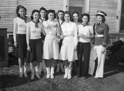 Fisher and Jones Counties Annual Livestock Shows. Hamlin High School band and pep squad, left to right, front row, Laverne Hix, Lanelle Carlton, Julia Pitcock, Charline Durham, and Vera Fielder; back row, LaRue Kite Virginia Brown, Virginia Hampton and Frances Gardner