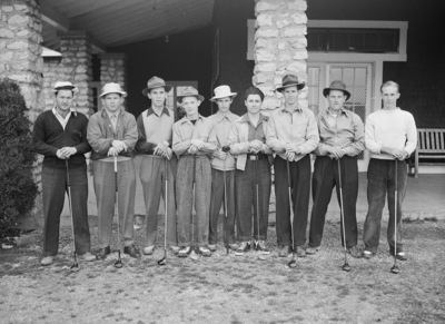 Golfers Texas Christian University. Left to right, Forrest Black, Captain Bob Sikes, Wallace Fitzgerald, Benton Beasley, L. H. McDaniel, Jimmy Moore, Gridder Kyle Gillespie, Brents Wooten and Ed Revercomb.