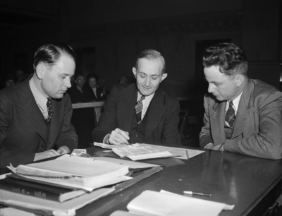 The Brewer Murder Trial is underway at the Tarrant County Courthouse. Earl T. Brewer, forty, is on trial for murdering his son-in-law H. Glen Cox at an east-side apartment on January 10, 1941. The Brewers and the Cox Family live on neighboring farms in Fannin County, Texas. Mr. Brewer's fourteen year old daughter eloped with the victim in Fort Worth, Texas. The slaying followed the first meeting after the marriage. Attorneys for Mr. Brewer sitting at a table left to right are Buster Cole, Otis Rogers, and Ardell Young. Mr. Cole, of Bonham, Texas, is wearing a striped suit. Mr. Rogers, of Fort Worth, Texas, is dressed in a dark three piece suit. Mr. Young, also of Fort Worth, is wearing a three piece pinstripe suit. Books and papers are covering the table.