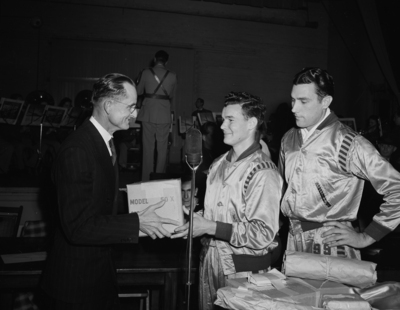 The Texas Wesleyan Rams basketball team is having one of their best seasons to date. They have recorded 17 straight victories to remain unbeaten. Before a game with McMurry University at the Recreation Building, the Rams players are receiving gifts. Left to right are Harrell Ashburn, Cecil McClung, and Jack Thornton. Mr. Ashburn is presenting the players with a radio. He is dressed in a suit. McClung and Thornton are both wearing their warm-up jackets and pants. The Rams went on to win their 18th game, led by Thornton who scored 18 points.