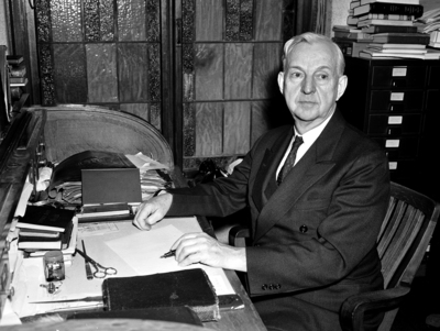 Here at his desk, where Sunday he passed another milestone in his long tenure as pastor of First Christian Church, is Reverend L. D. Anderson. The church gave him a reception for the start of his thirtieth year as pastor. His desk is a roll top. He is holding a pen over a blank piece of paper. Books are seen on a filing cabinet in the background. Published in the Fort Worth Star-Telegram morning edition, March 10, 1941.