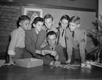 New officers of the Stamp Club at J. P. Elder Junior High School are shown here looking at a rare issue in the hands of the organization's president, Calvin Foster. Standing, left to right, Bobby Whisenant, vice president; Jack Locke, secretary, and Orville Prindle, J. W. Hall and Richard Roach, auctioneer. The club was organized eight years ago, and Miss Anna McGehee is sponsor. All of them are in an office room wearing shirts and uniforms. They are at a table, examining a piece of paper. There are a couple of boxes and number of stamps on the table. There is a "Boy Scouts of America" poster in the background. There is a board with handwritten notes next to them.