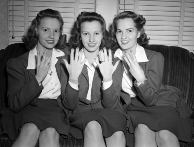 Triplet birthday Celebration. Left to right, Kathleen, Maureen, and Elaine Briant, triplet daughters of Mr. and Mrs. Guy Briant.