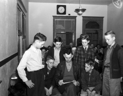 Knox County Boys in Fort Worth, Texas. Left to right, Bill Hendricks of Gorge; Pat Hill of Munday; Bobby Roberson of Vera; Knox County Farm Agent Walter W. Rice; Jerry Westbrook of Truscott; Kenneth Baker Junior of Munday and Charles Baker of Munday.