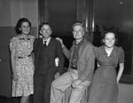 The Brewer Murder Trial is underway at the Tarrant County Courthouse. Earl T. Brewer, forty, is on trial for murdering his son-in-law H. Glen Cox at an east-side apartment on January 10, 1941. Mr. Brewer's fourteen year old daughter eloped with the victim in Fort Worth, Texas. The slaying followed the first meeting between Mr. Brewer and Mr. Cox, after the marriage. The Brewers and the Cox Family live on neighboring farms in Fannin County, Texas. Attending the trial left to right are Virginia Ruth Brewer Cox, T. Mount Cox, Joe D. Cox, and Lila Cox. Virginia is the wife of the victim and the daughter of the accused. She is wearing a short-sleeve, floral print dress. T. Mount is the father of H. Glen. He is dressed in a three-piece suit with a rolled-up Fort Worth Star-Telegram in his jacket pocket. Joe, T. Mount's cousin, is reuniting with the family after thirty-seven years. He is dressed in a button-up shirt, coat, and trousers. Lila is the victim's sister. She is wearing a collared dress with a zipper down the front. The group is posing in front of a window at the courthouse.