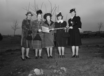Members of the South Side Garden Club, pictured with the traditional club spade which they used to begin the "Redbud trail" at a ceremony at Rosemont Park. They are, left to right, Mrs. L. G. Moreland, Mrs. Harold Craddock and Mrs. Melvin Nelson, committee workers, Mrs. Glynn LePhiew, president, and Mrs. H. A. Griffin, civic chairman. All the women are standing outside, holding the club spade. They are wearing coats and are holding purses. There are dead trees in the background.