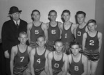Euless Basket Ball squad. Left to right, back row, Coach C. E. Liles, Junior Millican, Marvin Himes, Kenneth Slane, and Thad Himes. Front row, Troy Fuller, Billy Frank Godfrey, Henry James Uselton, Billy Joe Fuller and Marvin Fitch.