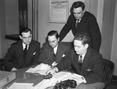 House Committee on Pensions Hearing Left to right, Representatives Houston McMurray, Henrietta; Gene McNamara, Waco, and Marvin B. Simpson Jr., Fort Worth; Standing is Ernest Boyett.