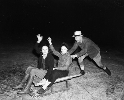 W. A. Schmid gives a sled ride to Isobel McFarland and Jean Copeland on frozen Lake Worth.