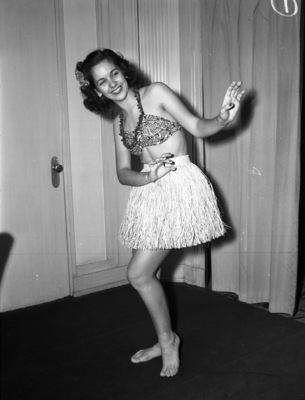 Dorothy Bryant in a grass skirt. She is shown dancing in the living room.