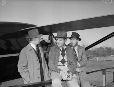 There was fresh excitement at the airport and the new Municipal Seaplane Dock at Lake Worth, and there would have been more if it had not rained . The seaplane dock (part of it is shown at the upper right) is ready for dedication. In this picture is, left to right, Captain D. C. Kelley, R. W. Cantwell and Captain R. S. Fogg. All of them are seen to be wearing hats. Published in the Fort Worth Star-Telegram.